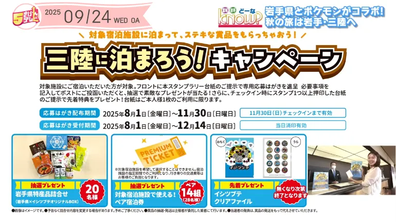 岩手応援ポケモン「イシツブテ」のオリジナルグッズや、沿岸地域の特産品、宿泊券などの豪華特典が当たるキャンペーンです。