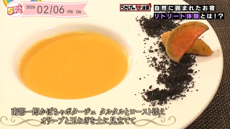 南部一郎かぼちゃポタージュ タルタルとロースト添え オリーブと玉ねぎを土に見立てて地元の特産品である南部一郎かぼちゃを使ったポタージュは、お皿の上で春を感じられる一品。