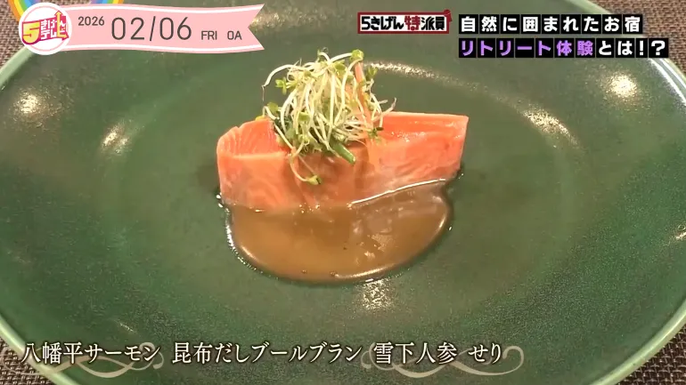 八幡平サーモン 昆布だしブールブラン 雪下人参 せり八幡平サーモンは、軽く火入れした身をバターと昆布だしを合わせたソースで楽しめます。