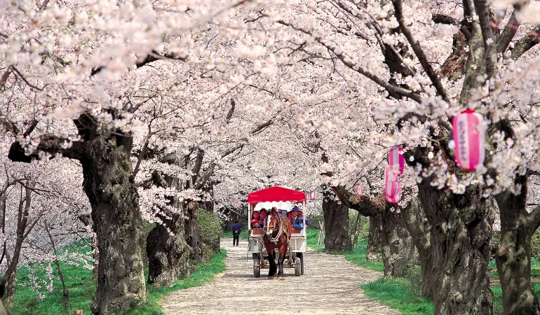まつりの期間中は2kmにわたる桜並木の中を観光馬車が走り、北上川の上にはこいのぼりが泳ぎ、夜には幻想的にライトアップされ、毎年多くの人で賑わいます。