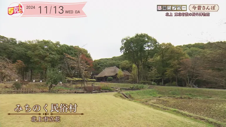 展勝地から道路を挟んですぐ向かいにある「みちのく民俗村」は、広大な敷地に南部曲り家などの茅葺民家を移築して、北上川流域の昔の姿を復元した野外博物館です。