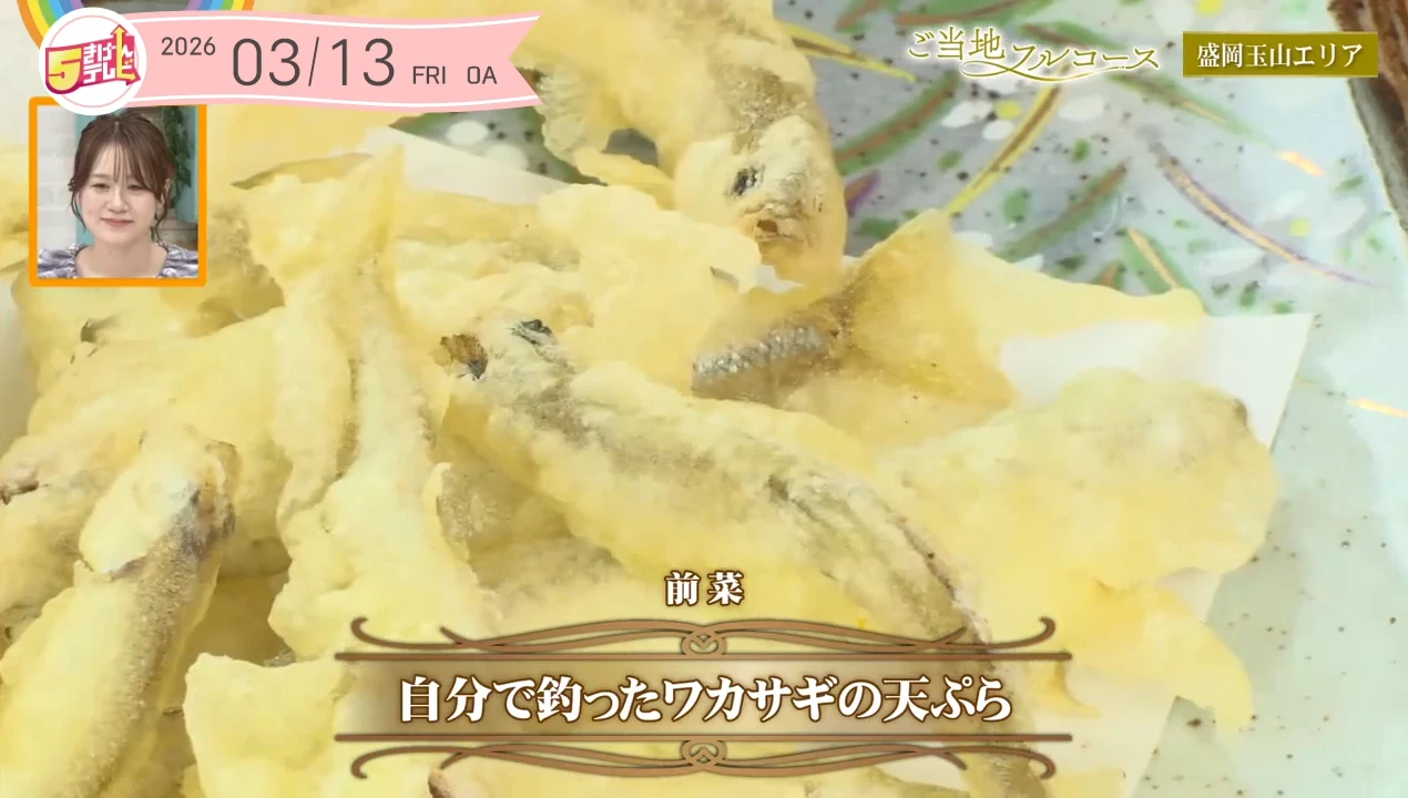ご当地フルコース in 玉山エリア、前菜は「自分で釣ったワカサギの天ぷら」です。