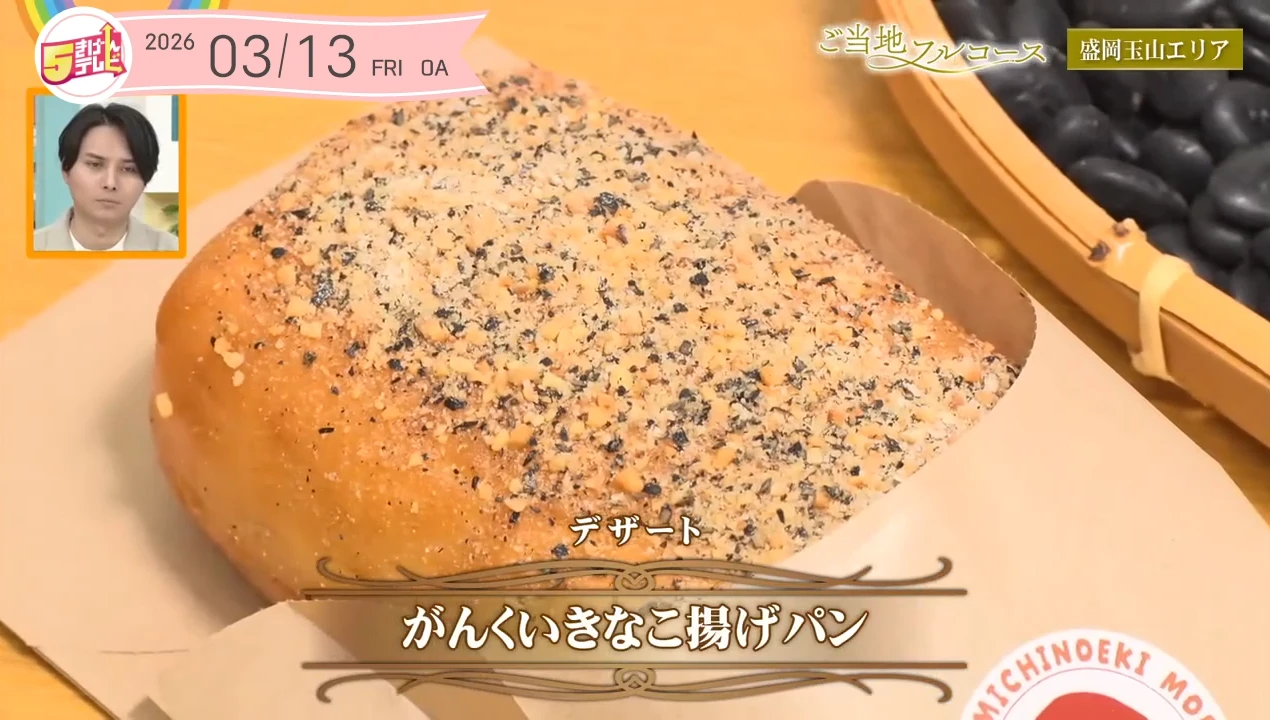 こちらのパンは「がんくいきなこ揚げパン」です。生産者さんや収穫に手間がかかるということで収穫量が減っている豆になっているがそんな貴重な豆を気軽に食べてもらいたくてきな粉にまぶして揚げパンになります。雁喰豆の魅力を広める活動に取り組む地域おこし協力隊の吉田さん、揚げパンの周りに雁喰豆のきな粉をまぶした新メニューを道の駅と共同で作り上げました。