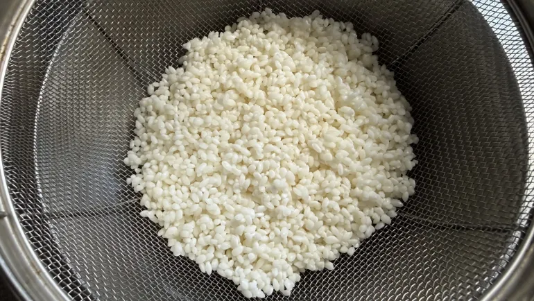 そして水に浸した餅米は一度ザルにあけ、蒸す前にしっかりと水をきっておく。