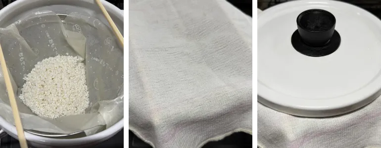 餅米入りのザルをセットしたら、鍋の上に菜箸を置き、布巾を被せ、鍋の蓋をして火にかける。