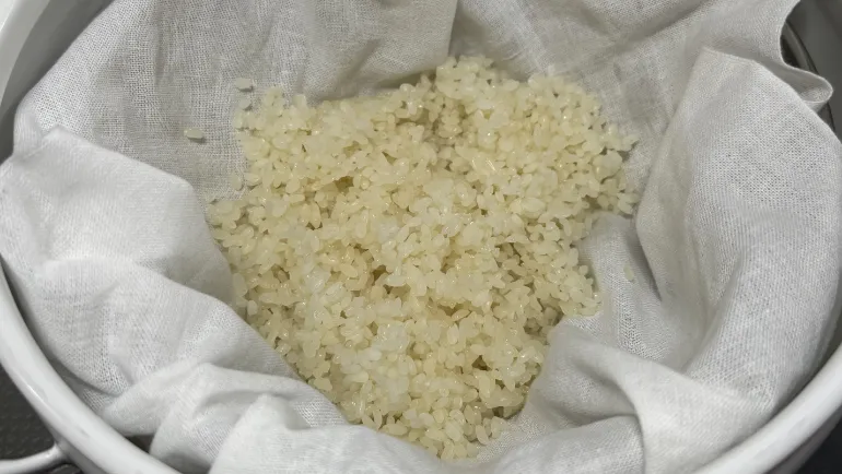 クッキングシートを投げ捨ててサラシを敷き、さらに蒸す。