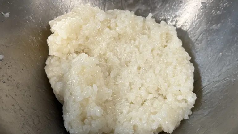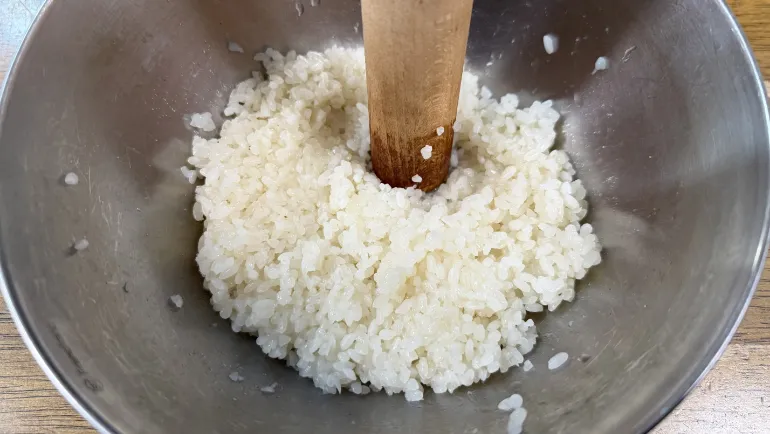 蒸した餅米をボウルに入れ、まずはマッシャーのような物で潰していく。