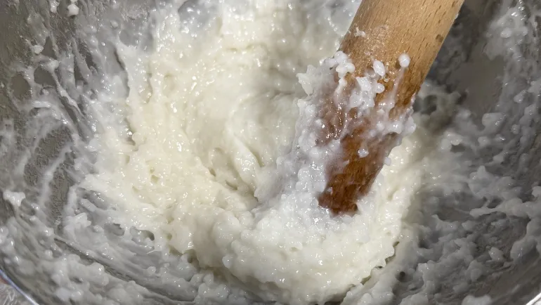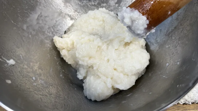 まだ視認できるほど米の粒が残っているが、餅らしく伸びるくらいまでにはなった。