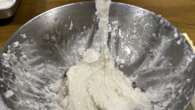 さらに粘度を増し、棒を上げた際にボウルを引き連れて餅米がくっついて来るようになる。